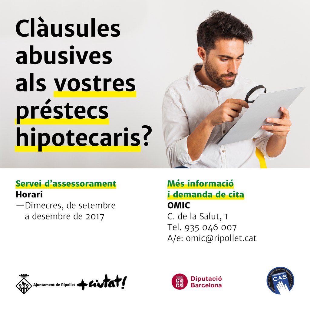 A partir del 6 de setembre i fins al 27 de desembre, l'Oficina Municipal de Consum oferirà l'assessorament d'un advocat per informar els consumidors sobre consultes relacionades amb les clàusules abusives en préstecs hipotecaris.