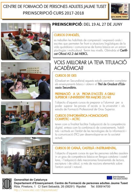 Comença la matriculació dels cursos del Centre de Formació d'Adults Jaume Tuset