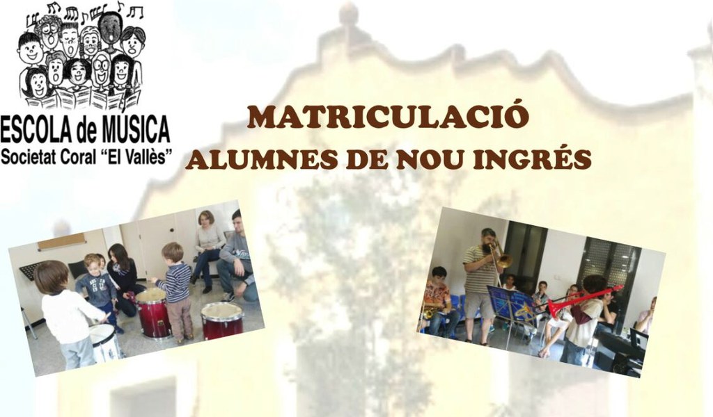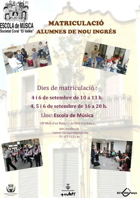 El 6 de setembre finalitza el període de matriculació als cursos 2017-2018 de l'Escola de Música de Ripollet. Les hores per formalitzar les matrícules són de 10 a 13 h i de 16 a 20 h i s'han de realitzar al CIP Molí d'en Rata. També es pot aconseguir més informació al telèfon 673 412 144 o al correu electrònic escolascv@gmail.com, així com a la web de la Societat Coral "El Vallès".