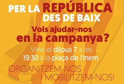 Compromís per Ripollet fa una crida a tota la gent que vulgui col·laborar en fer la campanya pel Sí de la CUP i de República des de Baix en el referèndum sobre la independència de Catalunya convocat per a l'1 d'octubre. Les persones interessades en col·laborar en la campanya han d'adreçar-se a la coneguda com a plaça de l'Inem, a la rambla de Sant Jordi, dijous a les 19.30 h.