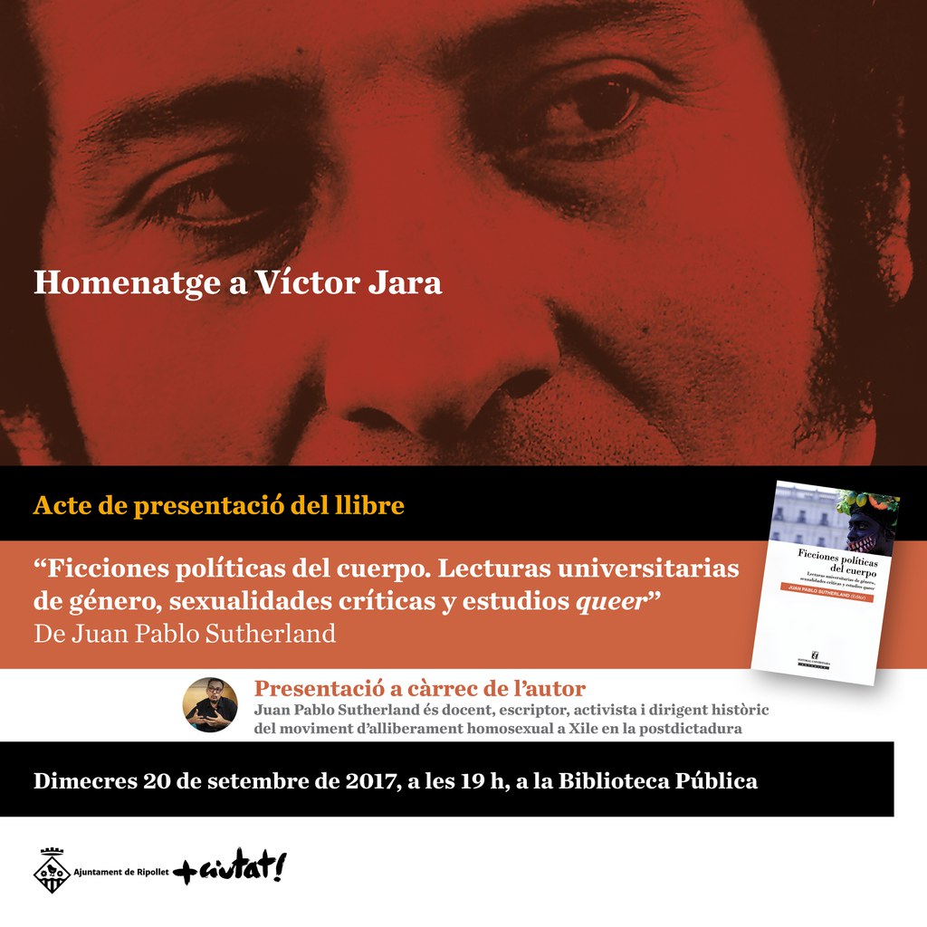 Ripollet torna a organitzar un acte d'homenatge al cantautor xilè Víctor Jara. El 20 de setembre, a les 19 h, la Biblioteca acollirà la presentació del llibre 'Ficciones políticas del cuerpo', de Pablo Sutherland, escriptor, activista i dirigent històric del moviment d'alliberament homosexual a la post dictadura xilena.