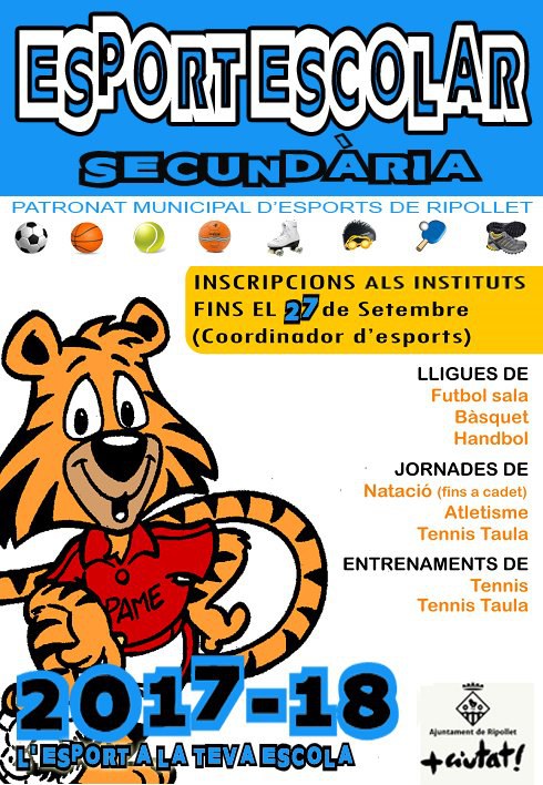 Fins al 27 de setembre és oberta la inscripció del programa d'Esport Escolar a les escoles i instituts de Ripollet. En el cas de la primària, s'ofereixen activitats de futbol sala, bàsquet, handbol, natació, atletisme, tennis taula, tennis i patinatge.