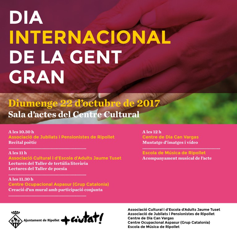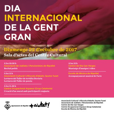 El diumenge 22 d'octubre al matí tindran lloc els actes, organitzats per l'Ajuntament de Ripollet, en commemoració al Dia Internacional de la Gent Gran, a la Sala d'Actes del Centre Cultural de Ripollet. La celebració d'aquest dia es realitzarà el pròxim dia 22, després que els actes quedessin ajornats a causa de la pluja el passat 30 de setembre.