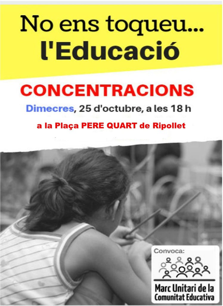 Des de Marc Unitari de la Comunitat Educativa (MUCE), s'han convocat concentracions per a aquest dimecres, 25 d'octubre, arreu de Catalunya, en protesta per les declaracions fetes per representants polítics tant del PP com de Ciutadans, posant en qüestió "la labor docent del professorat a Catalunya, acusant d'adoctrinament". A Ripollet, la concentració es realitzarà a la plaça de Pere Quart, a les 18 h.
