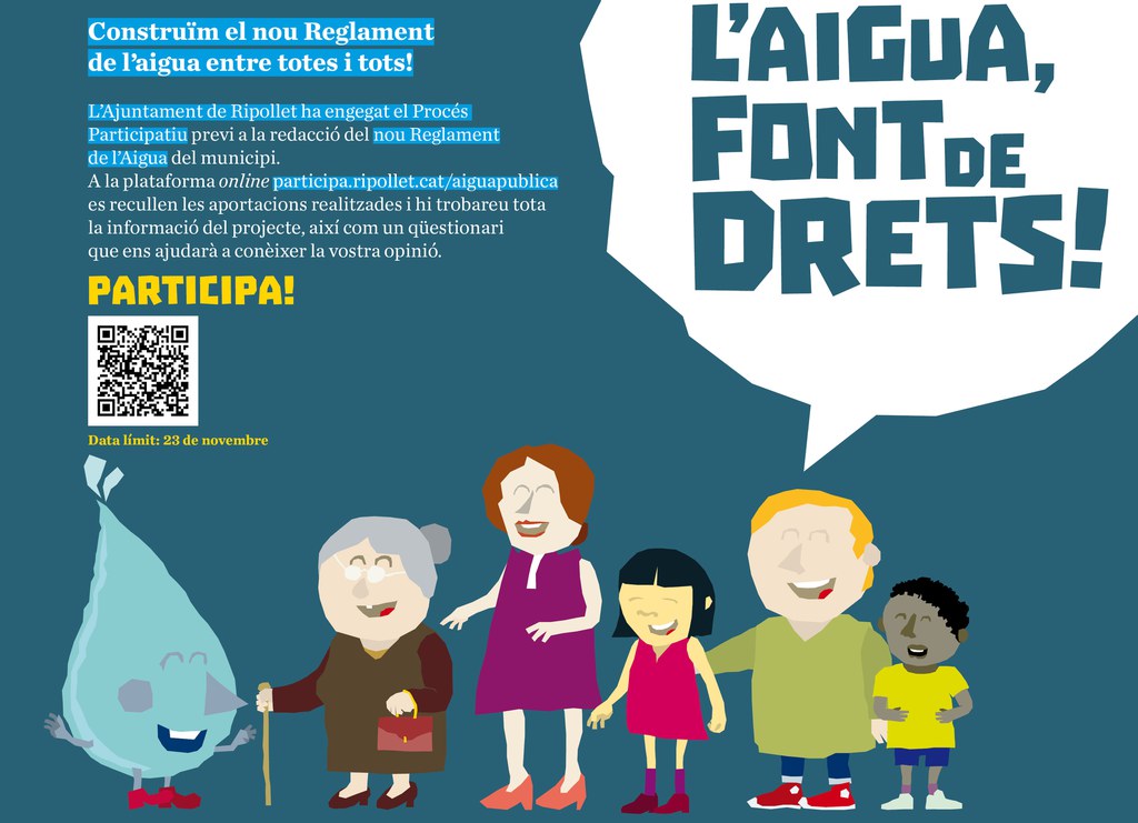 L'Ajuntament ha obert, fins el 23 de novembre, el termini per a participar en la redacció del Reglament de l'Aigua, un cop finalitzat el procés participatiu previ, dut a terme els mesos de setembre i octubre per part de les regidories de Serveis Municipals i Municipalització i de Participació. Així, a través de la web participa.ripollet.cat, totes les persones que vulguin poden fer les seves aportacions i suggeriments omplint el formulari de l'apartat "Aigua, font de drets".