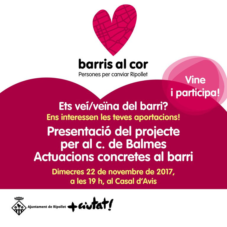 En resposta a les reiterades demandes veïnals per millorar el carrer de Balmes, especialment en el tram comprés entre el carrer Cot i el parc de Ferran Ferré, l'Ajuntament ha convocat una assemblea per a presentar un projecte amb un bon nombre d'actuacions concretes al barri. Serà en el marc del projecte Barris al cor i tindrà lloc dimecres, 22 de novembre, a les 19 h, al Casal d'Avis.