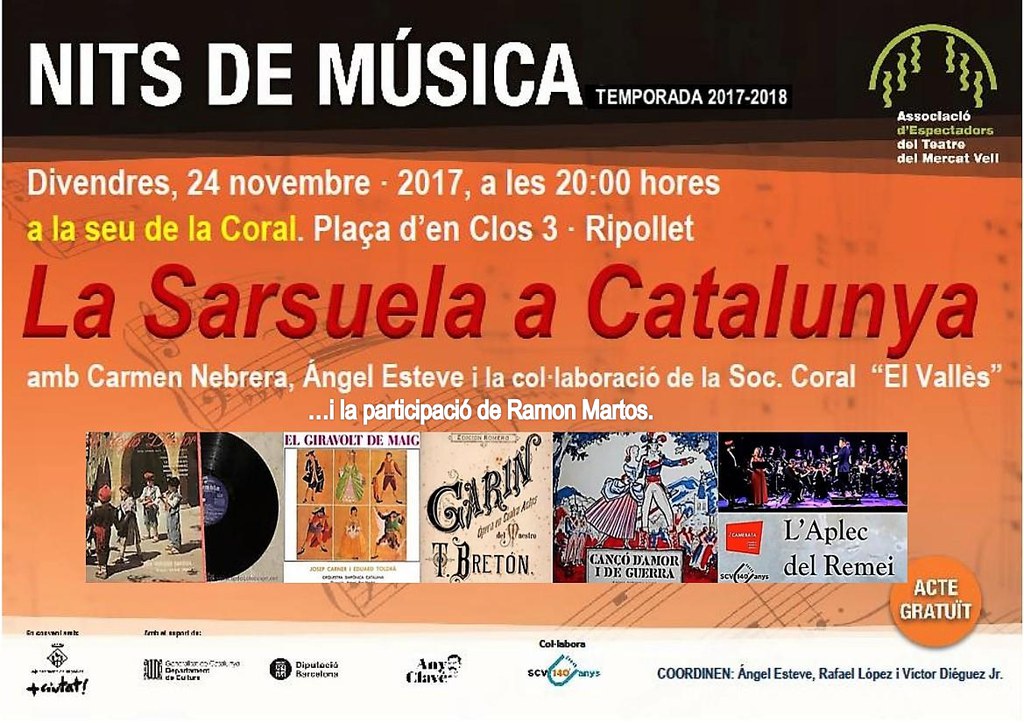 La seu de la Societat Coral "El Vallès" acull, aquest divendres 24, una nova sessió de les Nits de Música de l'Associació d'Espectadors del Teatre del Mercat Vell titulada "La Sarsuela a Catalunya".