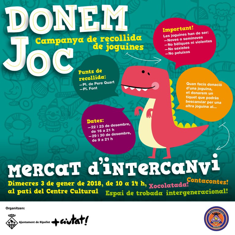 "Donem joc" és la campanya de recollida de joguines que organitza l'Ajuntament de Ripollet i Protecció Civil. La novetat d'enguany serà que el dia 3 de gener es farà un mercat d'intercanvi de joguines dirigit a tots els infants del municipi. "Hi podran participar tots els nens i nenes de Ripollet, independentment de la situació econòmica de la seva família, amb la idea de reutilitzar i de trencar una mica amb la dinàmica consumista que tenim per Nadal", comentava Montse Llorens, de Serveis Socials.