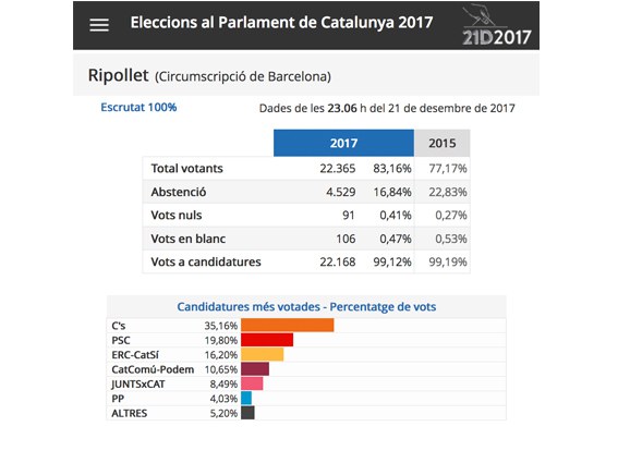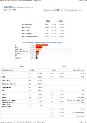 Ciutadans ha estat el partit més votat a Ripollet a les Eleccions al Parlament de Catalunya 2017, superant els seus propis resultats de 2015, assolint el 35,16% (7.831 vots, guanya 2.247 vots). En segon lloc, es troba el PSC, amb un 19,80% (4.411 vots, guanya 808 vots). El segueix, ERC amb el 16,2% (3.609 vots), Catalunya en Comú-Podem amb el 10,65% (2.372 vots) i Junts per Catalunya amb el 8,49% (1.890 vots). Amb una important davallada, se situen per sota del 5%: el PP amb el 4,03% (897 vots, perd 933 vots) i les CUP amb el 3,49% (777 vots, baixa 690 vots). Finalment, el PACMA obté l'1,35% (300 vots) i Recortes Cero-Grupo Verde el 0,36% (81 vots).