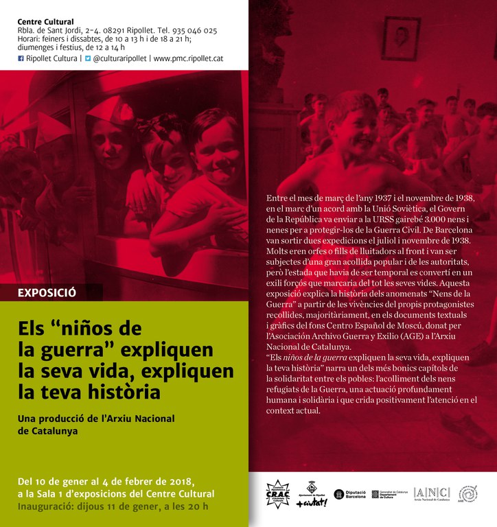 El 10 de gener va arribar a Ripollet l'exposició "Els 'Niños de la Guerra' expliquen la seva vida, expliquen la teva història" a la Sala 1 del Centre Cultural, fins al 4 de febrer. Es tracta d'una producció de l'Arxiu Nacional de Catalunya i compta amb la col·laboració de la Comissió Ripolletenca d'Activitats Culturals (CRAC), l'Ajuntament de Ripollet, la Diputació de Barcelona, la Generalitat de Catalunya i l'Asociación Archivo Guerra y Exilio (AGE).