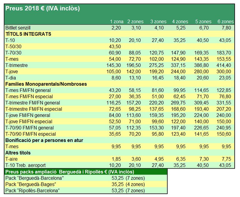 El Consell d'Administració de l'Autoritat del Transport Metropolità (ATM) ha aprovat els preus dels títols de transport del sistema integrat de l'àrea de Barcelona de l'any 2018. S'ha acordat un increment mitjà de les tarifes del 2%, després de 5 anys de contenció de preus. La T-10 d'una zona passarà a costar 10,20 euros, el que suposa un increment de 25 cèntims respecte al preu que hi havia fins ara, que es mantenia congelat des del 2015.