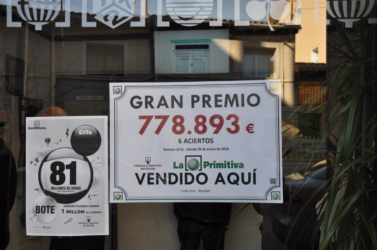 Una penya de Ripollet, formada per 21 ciclistes, ha guanyat 778.893,46 euros al sorteig de la Primitiva del passat dissabte, 20 de gener. La papereta de la penya, validada a l'Administració de Loteria n. 2, situada al carrer del Calvari, 108, va tenir un total de 6 encerts. Ho va fer amb una aposta simple i als números que jugava des de feia temps en dos sortejos setmanals. La responsable de l'administració ha informat que aquest mateix matí membres de la penya s'havien acostat al punt de venda per expressar la seva alegria i donar les gràcies a la venedora. Durant el matí el tema estava en boca de la nombrosa clientela i curiosos que s'acostaven a la botiga.