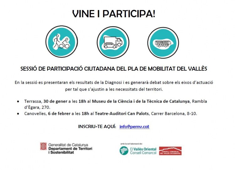 El Consell Comarcal del Vallès Occidental ha informat que pròximament es duran a terme noves sessions participatives centrades en els treballs del Pla Específic de Mobilitat del Vallès (PEMV), impulsat per la Generalitat de Catalunya amb la col·laboració dels ens comarcals tant del Vallès Occidental com Oriental. L'objectiu és definir propostes d'actuació a partir de la primera fase de diagnosi que recull les propostes presentades en les sessions inicials realitzades l'estiu del 2017. En el cas del Vallès Occidental, la sessió tindrà lloc en un acte obert a la ciutadania el 30 de gener a les 18 h, al Museu de la Ciència i la Tècnica de Catalunya de Terrassa. Les inscripcions es poden fer al correu info@pemv.cat.
