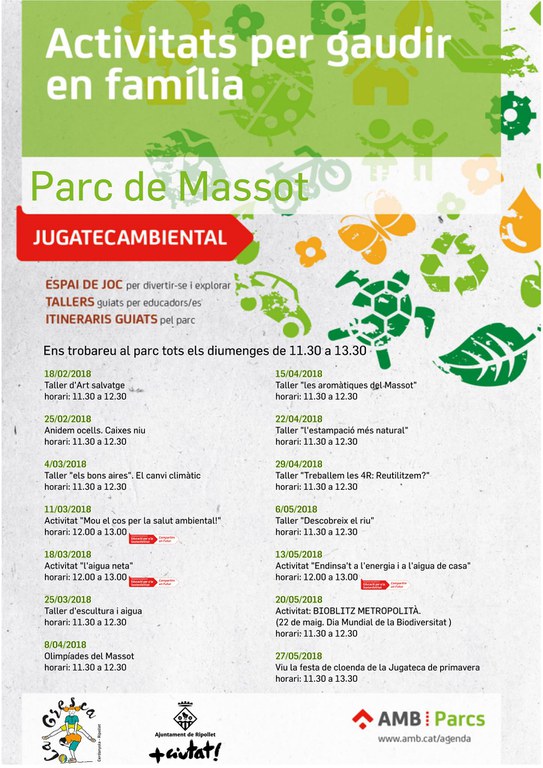 El Centre d'Esplai La Gresca inaugurarà, diumenge 18 de febrer, la Jugatecambiental al Parc de Massot amb el taller "Art salvatge", que pretén reconèixer el valor del parc transformant-lo en una obra artística efímera i feta amb materials naturals. L'activitat permetrà als infants relacionar-se amb els elements del seu voltant d'una manera lliure, emocional i artística. El taller es combinarà amb un espai de joc amb joguines especialment dissenyades per treballar diferents valors.