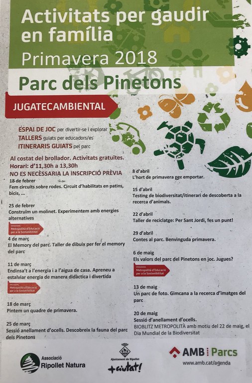 El Parc dels Pinetons també inaugura aquest diumenge la seva Jugatecambiental. L'associació Ripollet Natura és l'entitat encarregada de gestionar aquest espai de joc, tallers i itineraris guiats. Les activitats són totalment gratuïtes, no cal inscipció prèvia i també es realitzen tots els diumenges, d'11.30 a 13.30 h, fins al 20 de maig.
