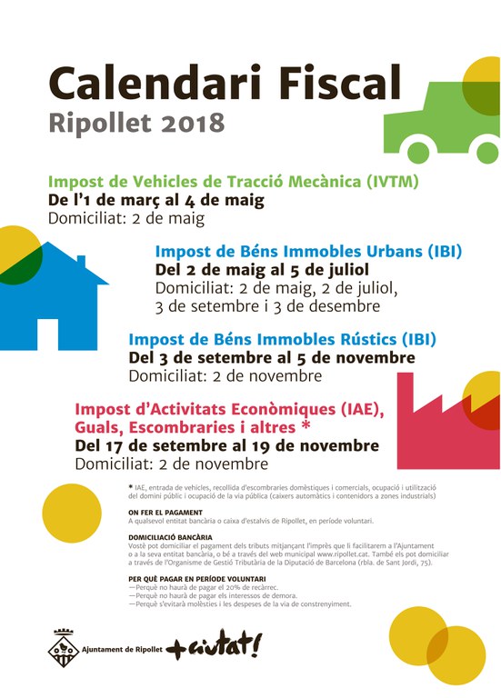 Dijous, 1 de març, es va iniciar el període voluntari per pagar l'Impost de Vehicles de Tracció Mecànica (IVTM), que s'allargarà fins el 4 de maig. Durant aquest període el pagament es pot realitzar a qualsevol entitat bancària o caixa d'estalvis de Ripollet. Aquelles persones que tinguin el rebut domiciliat rebran el càrrec al seu compte el 2 de maig. Aquest és el primer impost a pagar del calendari fiscal de Ripollet del 2018.
