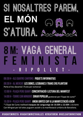 A les 12 h, està prevista una concentració a la plaça de Pere Quart, on es farà la lectura del manifest. Posteriorment, el Comitè de la vaga feminista organitza un dinar popular a la Torre Can Migrat. A la tarda, es convida tothom a assistir a la manifestació unitària convocada a Barcelona. Per això, a les 15.30 h, la plaça de Pere Quart es convertirà en el punt de trobada per anar "totes juntes cap a la manifestació a Bcn!". Per tal que tothom pugui assistir a la manifestació, el col·lectiu ofereix un servei d'acollida per a infants, de 16 a 22 h, a la Torre Can Mingrat.
