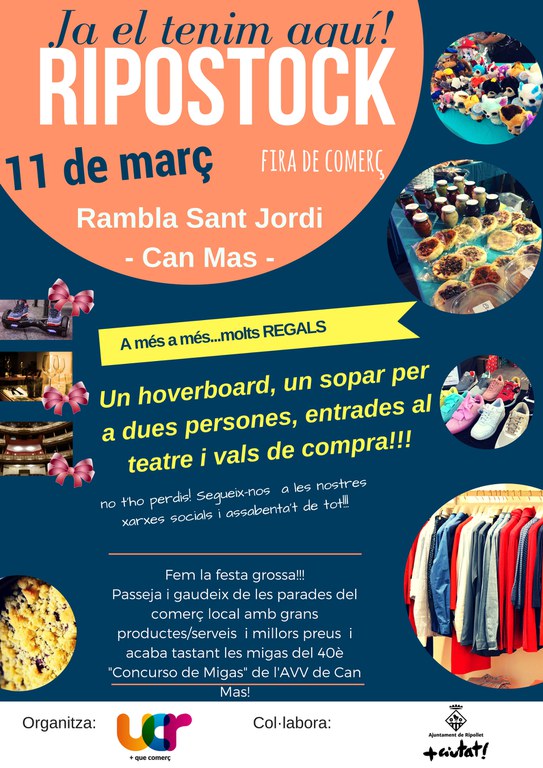 Aquest diumenge 11 de març, el barri de Can Mas acollirà una nova edició del Ripostock, de 10 a 15 h, una fira de comerç al carrer organitzada per la Unió de Comerciants de Ripollet (UCR). Gairebé una trentena d'establiments locals exposaran els seus productes i serveis a la rambla de Sant Jordi, entre els carrers Covadonga i Sarrià de Ter, una iniciativa que enguany s'instal·la al barri de Can Mas, amb l'objectiu "d'apropar el comerç als diferents barris, perquè tots hi tenen dret i tothom pugui gaudir de l'esdeveniment", explica Sergi Samper, president de la UCR.