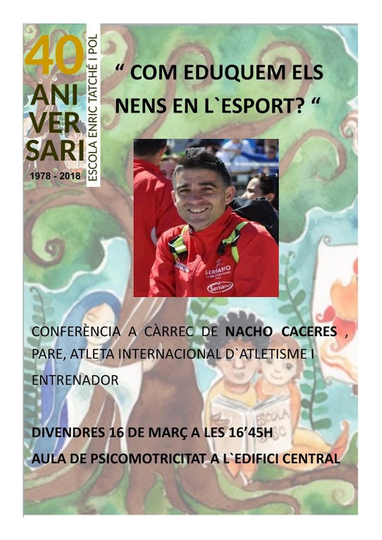 Aquest divendres, dia 16, l'escola Enric Tatché acollirà la conferència "Com eduquem els nens en l'esport?", a càrrec de Nacho Cáceres, atleta internacional d'atletisme i pare. Aquesta és la segona xerrada que s'emmarca dins els actes del 40è aniversari de l'escola Enric Tatché i està oberta a qualsevol persona interessada. L'acte tindrà lloc a l'Aula de Psicomotricitat de l'edifici central de l'escola a les 16.45 h.