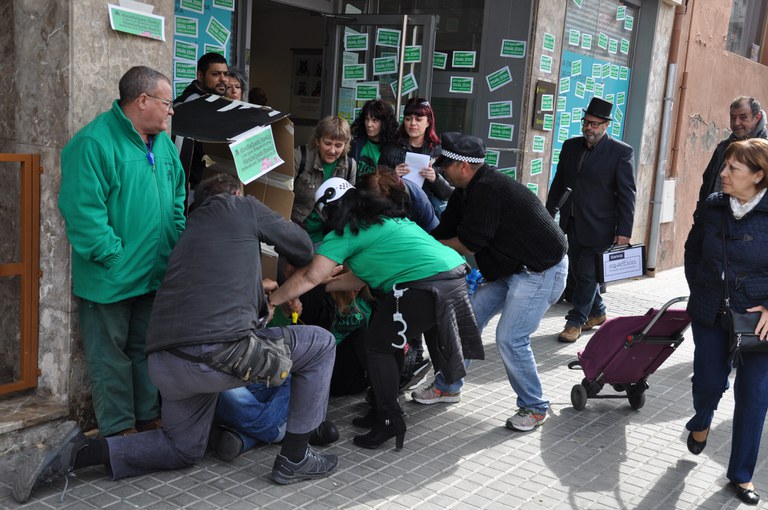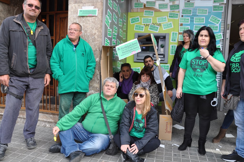 La Plataforma d'Afectats per la Hipoteca Ripollet-Cerdanyola s'enfronta aquesta setmana al desnonament de les famílies de David i Sonia, amb dos menors cadascun. Donat que els dos habitatges són propietat de Bankia, que s'ha negat a suspendre el desnonament, aquest matí la PAH s'ha mobilitzat a la seu que l'entitat bancària té a la rambla de Sant Jordi. Es tracta de dos casos que han passat per la Taula d'emergència en l'àmbit de l'habitatge de la Generalitat i resten a l'espera de l'adjudicació d'un habitatge, que no arriba. Durant la protesta, afectats i activistes de la PAH han representat un desnonament.
