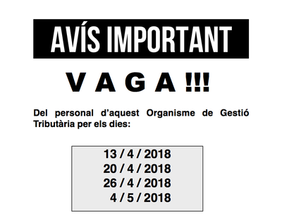 Els treballadors i treballadores de l'Organisme de Gestió Tributària de la Diputació de Barcelona han convocat quatre dies de vaga: el 13, 20 i 26 d'abril i el 4 de maig. L'oficina de Ripollet (rambla de Sant Jordi, 75) romandrà tancada en aquestes dates. L'últim dia de vaga coincideix amb el darrer dia de pagament en via voluntària de l'impost de vehicles de tracció mecànica (IVTM).