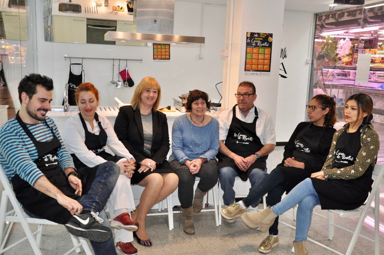 "És un projecte molt xulo i engrescador que converteix el Mercat en un espai de convivència", ha assegurat la primera tinent d'Alcalde, Pilar Castillejo, durant la presentació, aquest dimarts, 17 d'abril, de l'aula de cuina. La regidora de Comerç, Indústria i Turisme i Mercat Municipal ha estat acompanyada per la Directora del Centre de Normalització Lingüística, Montserrat Trilles; els paradistes del Mercat Susana Rodríguez i Manolo Mor; el cuiner Albert Jané, de Ca L'Elvira i dues alumnes dels cursos de català que col·laboren amb el projecte.