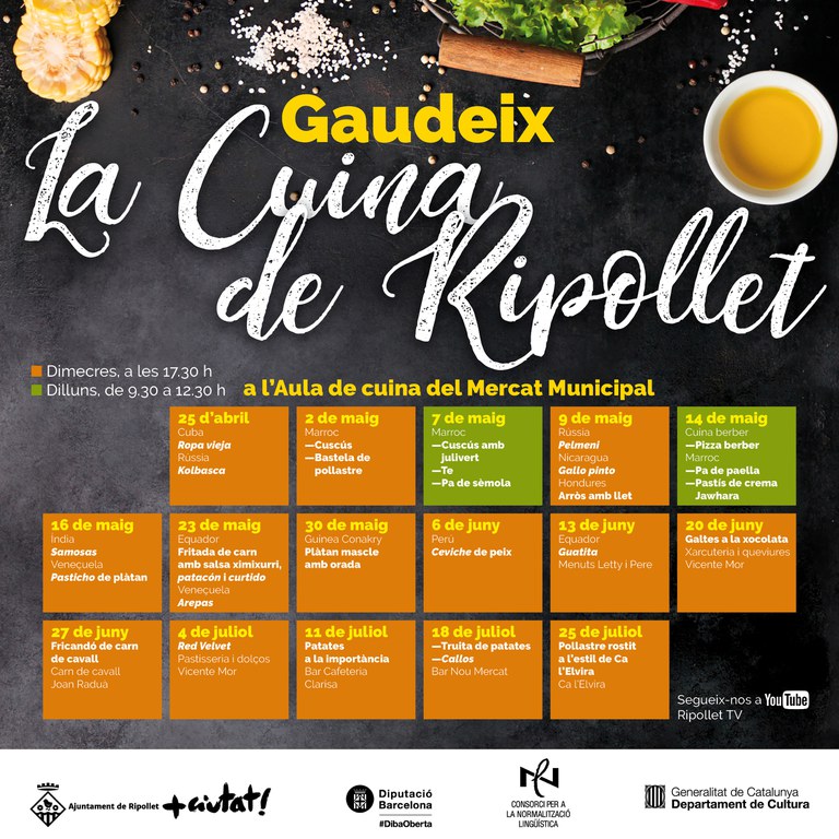 "La cuina de Ripollet" és un projecte endegat per la regidoria de Comerç de l'Ajuntament, amb el suport del Consorci de Normalització Lingüística. Es durà a terme a L'aula de cuina del Mercat, que acollirà setze jornades de cuina, amb la voluntat de dinamitzar el Mercat i visualitzar, de la mà de parades, restauradors i persones voluntàries, la diversitat gastronòmica de la ciutat, des d'una vessant intercultural.