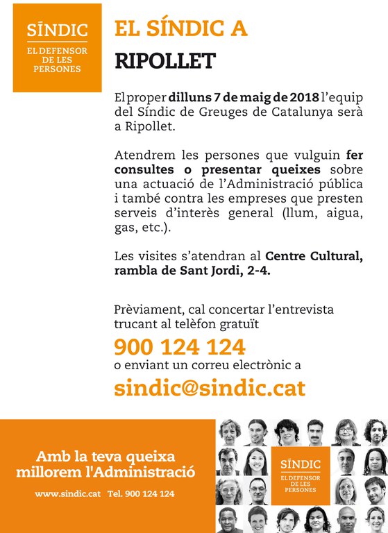L'oficina del Síndic de Greuges es desplaçarà a Ripollet el pròxim dilluns, 7 de maig, per atendre les persones que vulguin fer consultes o presentar queixes sobre una actuació de l'Administració pública i també contra les empreses que presten serveis d'interès general (llum, aigua, gas, etc.).
