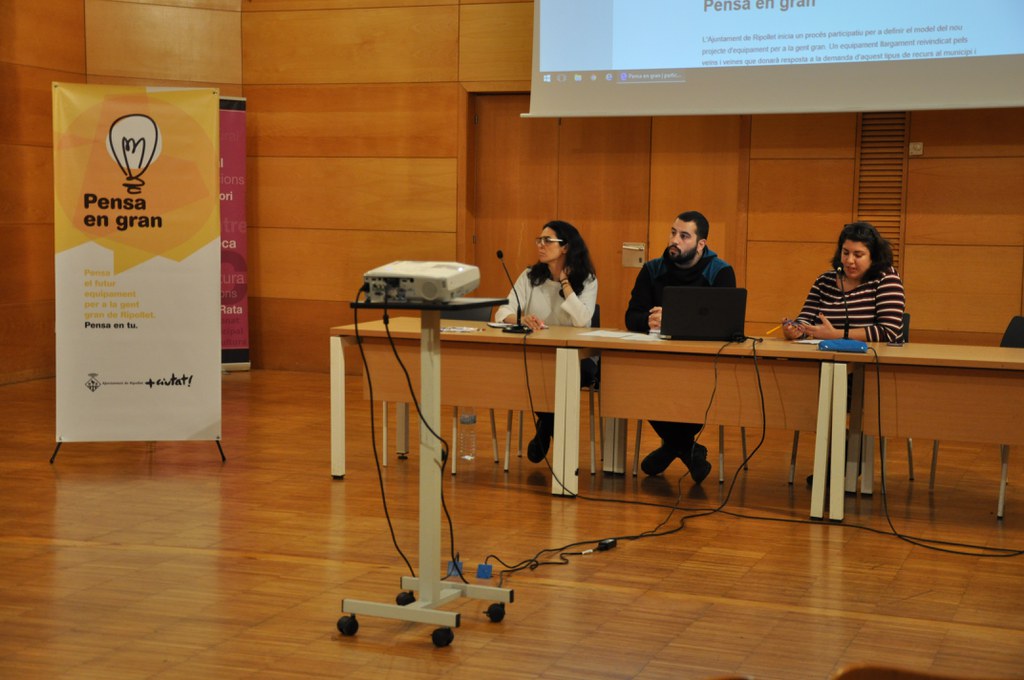 La regidora de Gent Gran, Reyes Muñoz, va presidir l'acte, acompanyada dels responsables del procés participatiu, Genís Giner i Marta Morales, de Suara Cooperativa. "Pensa en gran" es divideix en cinc fases: difusió, diagnòstic, debat i creació de propostes, concreció de propostes i validació i retorn. Es va convidar a tots els assistents, entre els quals hi havia representants de partits polítics, entitats, professionals de l'atenció a les persones grans i ciutadans a títol individual, a formar part del grup participatiu. Formar-ne part requereix compromís amb el procés, d'uns dos mesos de durada, i la participació en les sessions programades, les quals tindran lloc els dijous, a partir de les 17.30 h. Un cop constituït el grup participatiu es començarà a treballar la proposta comuna, que inclourà tant el disseny de l'equipament com l'oferta de serveis que oferirà.