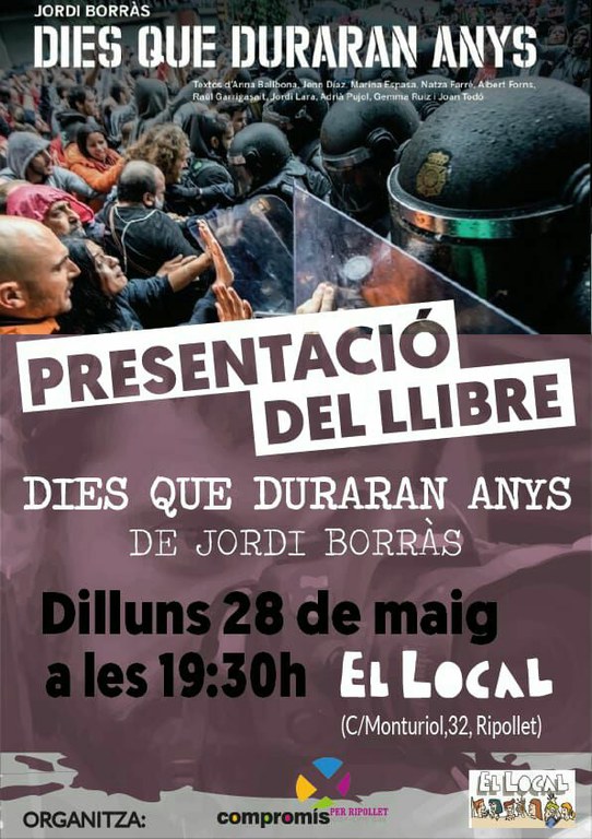 Avui, dilluns 8 de maig, a les 19.30 h, tindrà lloc a El Local (C/Monturiol, 32, Ripollet) la presentació del llibre Dies que duraran anys (Ara llibres), de Jordi Borràs.