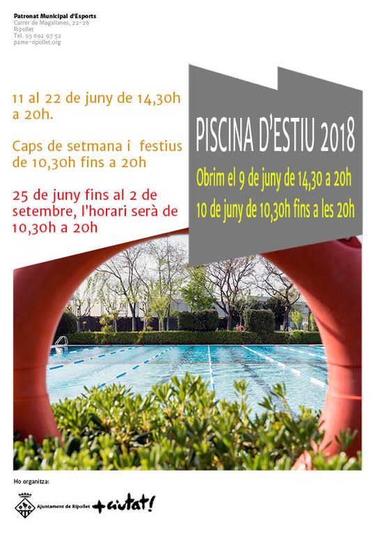 La piscina descoberta del Poliesportiu romandrà oberta al públic a partir d'aquest dissabte, 9 de juny. En la jornada inaugural d'aquesta temporada d'estiu, la piscina estarà oberta a partir de les 14.30 hores i fins a les 20 h. L'endemà, diumenge 10 de juny, la piscina obrirà les seves portes de 10.30 a 20 h.