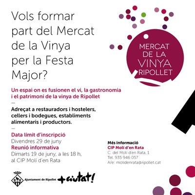 Dimarts, 19 de juny, a les 18 h, l'Ajuntament ofereix una xerrada informativa adreçada a tots aquells restauradors, hostalers, cellers, bodegues, establiments alimentaris i productors que estiguin interessats a participar en l'edició d'enguany del Mercat de la Vinya.