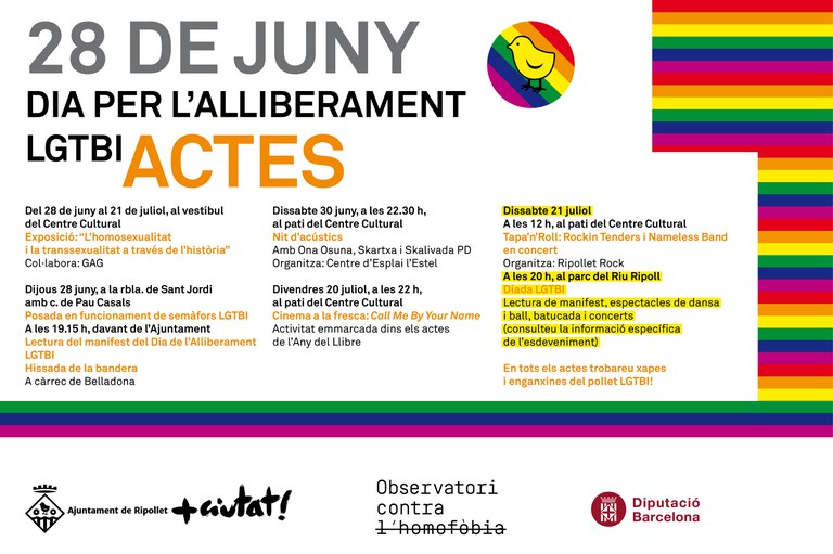 Ripollet tornarà a celebrar l'orgull LGTBI, amb un ampli programa festiu i reivindicatiu, que començarà aquest 28 de juny, Dia per l'Alliberament LGTBI, abans del Ple Municipal, amb la lectura del manifest, a càrrec de la nova entitat Belladona i la hissada de la nova bandera "trans" del municipi, amb els característics pollet i l'arc de Sant Martí transversal. El mateix dia, també es posen en funcionament els semàfors LGTBI, amb noves lluminàries, una amb dues noies i l'altra amb dos nois agafats de la mà i també obre, al Centre Cultural, l'exposició "L'homosexualitat i la transsexualitat a través de la història", que es podrà visitar fins al 21 de juliol. A més, se sumen als actes LGTBI l'Esplai l'Estel, amb el concert Nits d'acústic del 30 de juny i el cinema a la fresca del 20 de juliol.