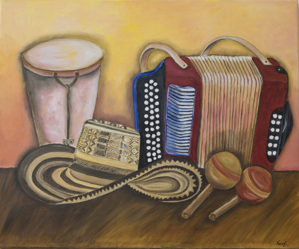 Foto: quadre d'intruments típics colombians. Oli de Nancy Céspedes.