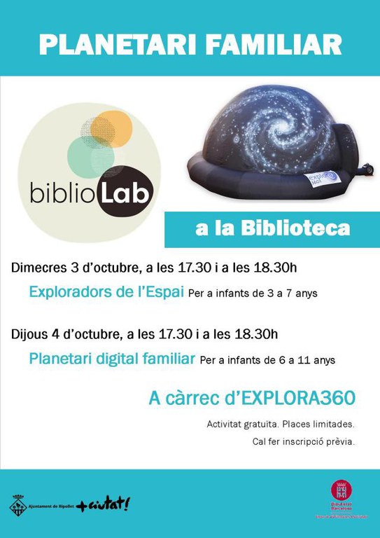 La Biblioteca de Ripollet acollirà el proper dimecres 3 i dijous 4 d'octubre un Planetari digital, per a descobrir els secrets de l'univers d'una forma amena i innovadora. L'activitat, subvencionada per la Diputació de Barcelona s'emmarca dins del programa BiblioLab, un projecte de la Xarxa de Biblioteques Municipals (XBM).