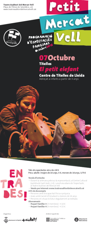 El Centre de Titelles de Lleida serà el responsable d'inaugurar la temporada 2018-19, amb el seu muntatge de titelles "El petit elefant", diumenge, a les 18 h. Es tracta d'una adaptació del conte del mateix nom de Rudyard Kipling, on l'animal, molt tafaner, s'endinsa en la jungla per trobar resposta a totes les seves preguntes. És un espectacle recomanat per a infants de 3 a 8 anys.