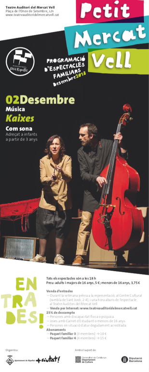 El 2 de setembre, a les 18 h, el Teatre Auditori acollirà la darrera producció de la companyia Com Sona: "Kaixes". L'espectacle combina la música popular i la cançó d'autor, on cadascuna de les peces esdevé un joc a través del teatre d'objectes. També s'adreça a infants a partir de 3 anys.