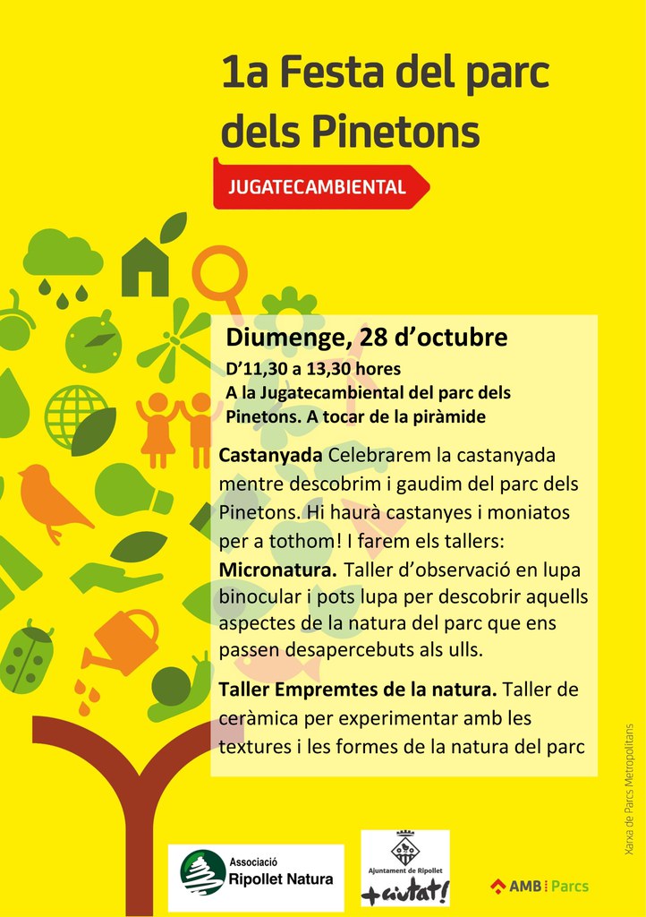 La sessió de Jugatecambiental del parc dels Pinetons del pròxim diumenge, 28 d'octubre, serà especial, ja que se celebrarà la 1a Festa del parc dels Pinetons. Es tracta d'una jornada festiva amb tallers i activitats, organitzada aprofitant la celebració de la castanyada i de la tardor, amb l'objectiu de posar èmfasi en els valors del parc i apropar-lo a la ciutadania, d'una forma festiva i divertida.