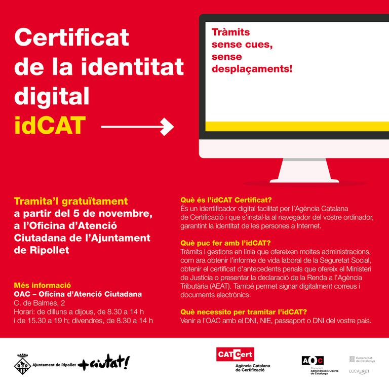 A partir d'aquesta setmsna ja es pot tramitar gratuïtament el Certificat de la identitat digital (idCAT) a l'Oficina d'Atenció Ciutadana (OAC) de l'Ajuntament de Ripollet. L'idCAT és un identificador digital facilitat per l'Agència Catalana de Certificació que s'instal·la al navegador de l'ordinador per garantir la identitat de les persones a Internet. Així, es pot assegurar la integritat i confidencialitat de les transaccions electròniques, a més d'operar amb les administracions públiques o signar documents i correus electrònics amb totes les garanties.