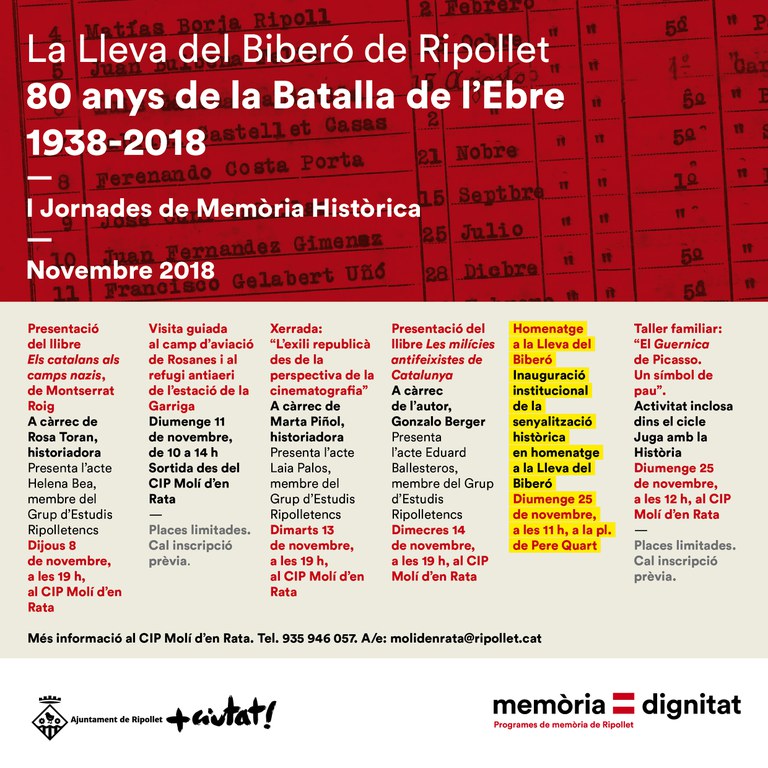 Les jornades culminaran diumenge, 25 de novembre. A les 11 h, a la plaça de Pere Quart, es farà un homenatge als joves de Ripollet que van formar part de la Lleva del Biberó, en el 80è aniversari de la Batalla de l'Ebre. Es presentarà una senyalització permanent a l'espai on va viure Sever Bigas, lluitador antifranquista molt implicat en l'associacionisme ripolletenc i també un dels biberons, i que serà la primera d'un conjunt sobre llocs de memòria que es vol instal·lar a la ciutat. Posteriorment, a les 12 h, l'activitat Juga amb la Història del CIP Molí d'en Rata serà un taller familiar titulat "El Guernica de Picasso. Un símbol de pau". Es parlaran de diferents conceptes relacionats amb la pintura i la història, es farà una aproximació a l'obra i, posteriorment, es crearà una recreació lliure des d'una perspectiva actual. Per gaudir d'aquesta activitat, cal realitzar la inscripció prèviament, abans del 23 de novembre, al 93 594 60 57 o molidenrata@ripollet.cat. El preu és d'1,5 € per a infants menors de 5 anys i de 4 € per a la resta.