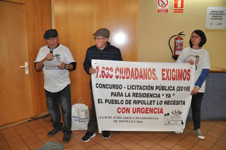 El Club de Jubilats i Pensionistes va ser present al ple i el seu president, José Luís Fernández, va intervenir fora de l'ordre del dia per fer un prec i una pregunta. Va demanar que licités la residència aquest 2018 i la raó per la qual no van ser convidats a la reunió que l'Ajuntament va tenir, el mes d'agost, amb el Conseller d'Assumptes Socials i Famílies, Chakir el Homrani. L'alcalde va respondre que era impossible fer la licitació aquest any i que es va preferir que aquesta primera reunió amb el conseller fos entre administracions.