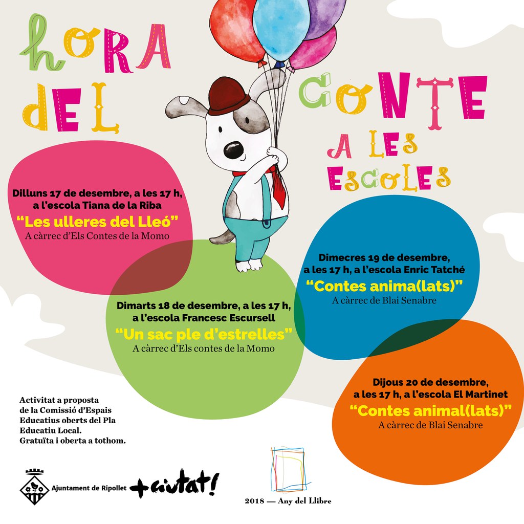 - Dimecres, 19 de desembre, a les 17 h. "Contes anima(lats)" a càrrec de Blai Senabre, a l'escola Enric Tatché.