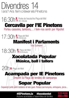 Les hores prèvies a l'acampada nocturna seran una festa reivindicativa a la mateixa Plaça del Molí. Aquest espai serà el punt i final de la cercavila i l'escenari per a tallers infantils, actuacions musicals, ball i una xocolatada. Es comptarà amb la col·laboració d'alumnes del taller de dansa de Pinetons que dirigeix el coreògraf local Juan López i també hi actuarà la coral de l'escola.