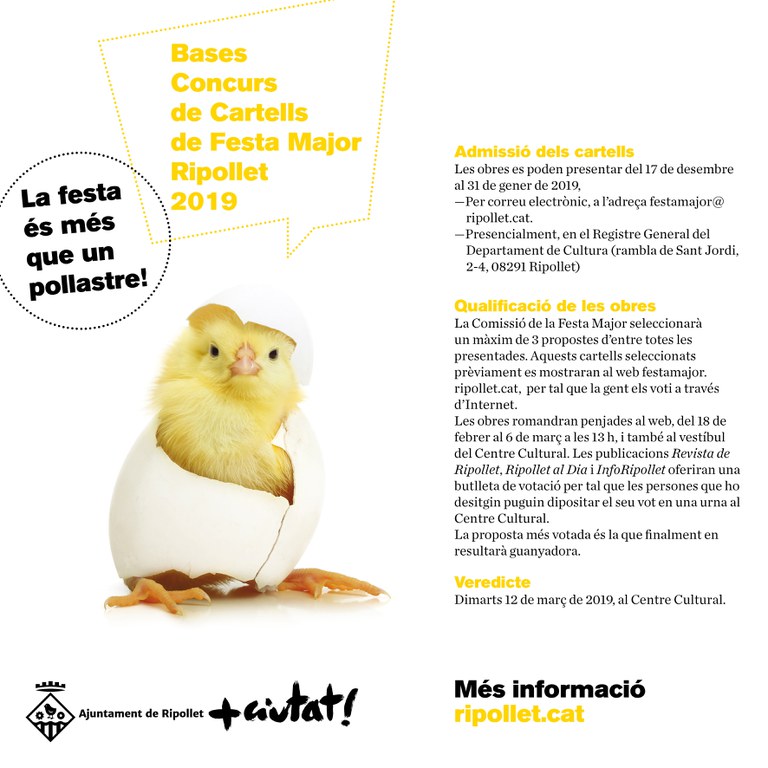 L'Ajuntament de Ripollet ha obert el termini de presentació de les obres del Concurs de cartells per la Festa Major 2019. Com cada any, aquest certamen té la finalitat d'escollir la imatge de les festes que tindran lloc el 23, 24, 25 i 26 d'agost de 2019. Enguany, la Comissió de la Festa Major ha treballat amb la idea que "la Festa és més que un pollastre", fent referència al fet que gran part dels cartells que es presenten cada any tenen el pollastre com a element central.