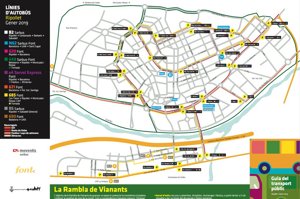 La guia, de la qual s'han editat 20.000 exemplars, es repartirà també als autobusos i a edificis municipals. Pel que fa als canvis i actualitzacions, s'han incorporat els horaris millorats de l'e4 Font, les noves parades i el canvi d'ubicació d'altres a les línies 648 Sarbus-Font (Bellaterra-Ripollet-Montcada i Reixac) i 690 Font (Badalona-Sant Coloma-Montcada i Reixac-Ripollet-Cerdanyola UAB). Alguns d'aquests canvis responen a demandes ciutadanes, com és el cas de l'AFA Els Pinetons i altres provinents a peticions de la Taula per la Diversitat Funcional.