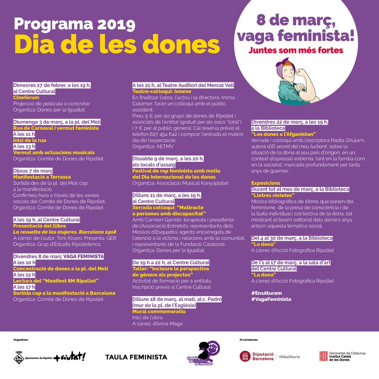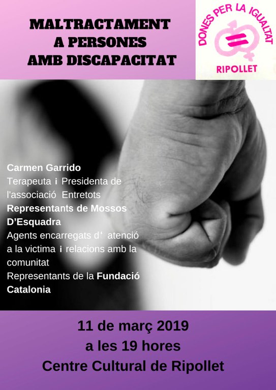 El grup Dones per la Igualtat de Ripollet organitzen el dilluns, 11 de març, a les 19 h, una xerrada sobre el 'Maltractament a persones amb discapacitat', amb la terapeuta i presidenta de l'associació Entretots, Carmen Garrido; agent d'Atenció a la Víctima del cos de Mossos d'Esquadra i representants de la Fundació Catalònia.