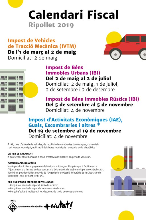 El passat 1 de març va començar el termini per al primer dels pagaments del Calendari fiscal de Ripollet 2019, corresponent a l'Impost de Vehicles de Tracció Mecànica (IVTM), que s'allargarà fins al 2 de maig. Entre maig i juliol s'haurà de fer el pagament de l'Impost de Béns Immobles Urbans (IBI) i el darrer trimestre de l'any serà el torn de l'Impost de Béns Immobles Rústics i de l'Impost d'Activitats Econòmiques (IAE), Guals i Escombraries.