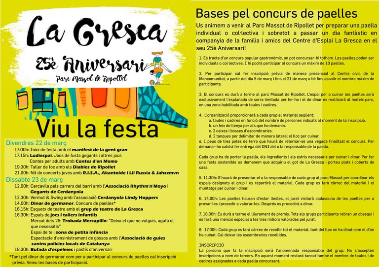 Des de La Gresca, es recorda que tant pel dinar de germanor com per a participar al concurs de paelles, cal fer una inscripció prèvia. Per més informació, consulteu el programa de la festa.
