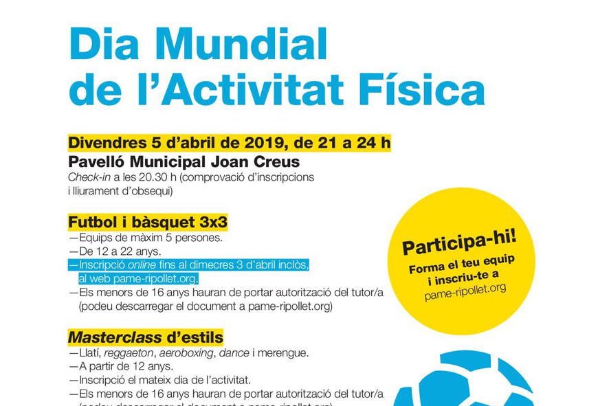 L'Ajuntament de Ripollet, a través de la comissió Salut i Joves, ha planificat dues activitats esportives i saludables pel divendres 5 d'abril, amb motiu del Dia mundial de l'activitat física (DMAF), que se celebra el dia següent. Com a novetat, les activitats de nit, al Pavelló Joan Creus, inclouen partits de bàsquet 3x3 i de futbol, on cal inscriure's al web PAME, per equips de màxim 5 persones, d'entre 12 i 22 anys.També hi haurà, com l'any passat, una masterclass d'estils, que inclou llatí, reggaeton, aeroboxing, dance i merengue.
