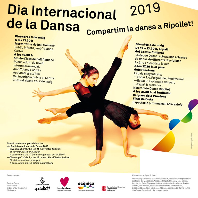 El Dia Internacional de la Dansa 2019 està inclòs dins de l'any Scènica 2019, està co-organitzat pel Patronat d'Esports, el Patronat de Cultura, Bunkay Dansa, Dansa Jove, Urban Show (Epidemic) i SB Dance, a més de comptar el suport d'una quinzena d'associacions. Els encarregats de presentar el cartell han estat el regidor de Cultura, Oriol Mor; Noelia España de Danza Joven Noelia España i Juan López d'Epidemic Dance Show.